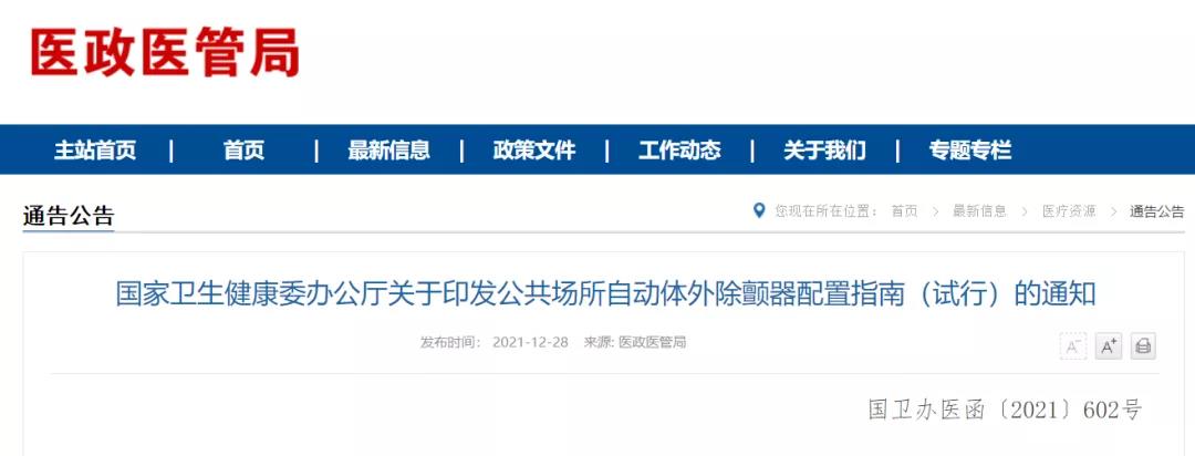 2021年12月13日,國家衛(wèi)生健康委下發(fā)《關(guān)于印發(fā)公共場所自動體外除顫器配置指南(試行)的通知》,供各地在公共場所配置自動體外除顫器時參照使用。通知要求地方各級衛(wèi)生健康部門應(yīng)組織有關(guān)專家為本地配置自動體外除顫器提供技術(shù)支持,開展自動體外除顫器使用等急救知識技能的培訓(xùn)工作,推動自動體外除顫器配置與院前醫(yī)療急救服務(wù)相銜接。鼓勵有條件的地方借助互聯(lián)網(wǎng)技術(shù)建立自動體外除顫器遠程管理系統(tǒng),對自動體外除顫器的運行和為何保養(yǎng)實時監(jiān)控管理,并建立自動體外除顫器地圖、自動體外除顫器導(dǎo)航,為公眾提供更加準確的自動體外除顫器地理位置服務(wù)。