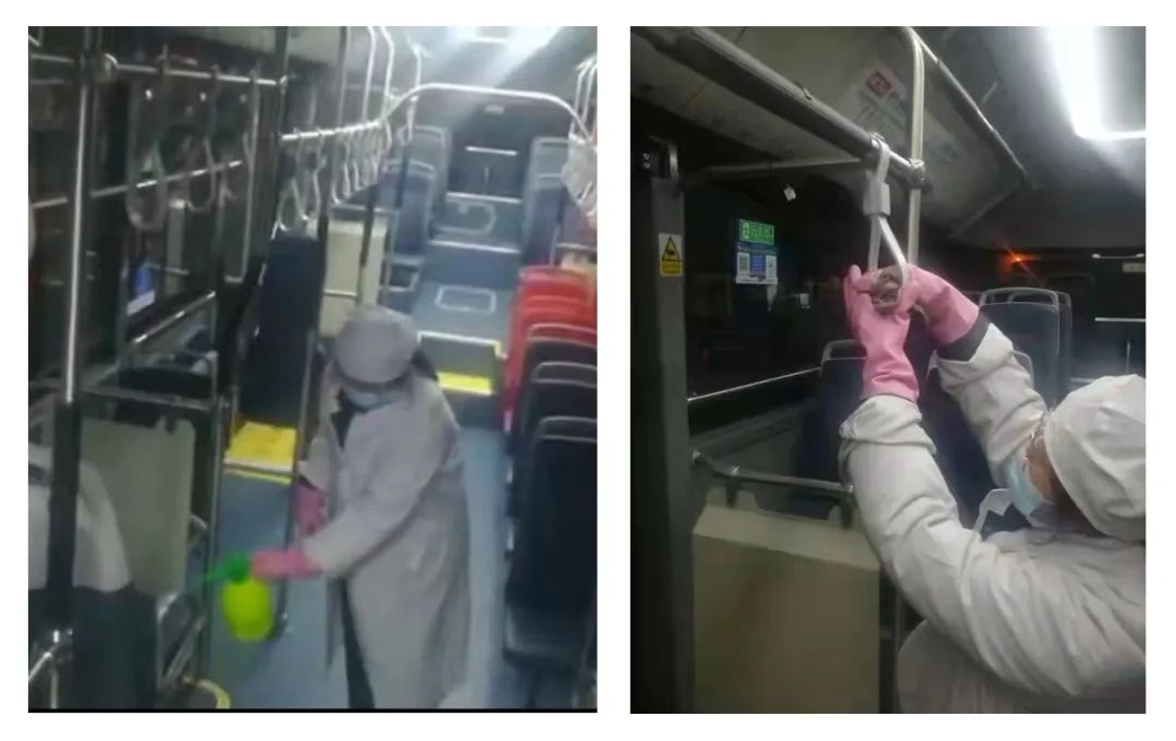 工作人員為班車進(jìn)行清潔、消殺