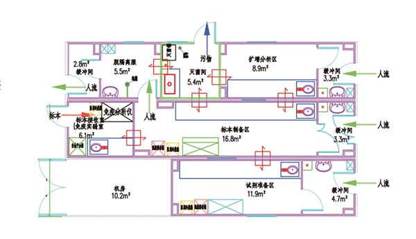 臨床基因擴(kuò)增檢驗(yàn)實(shí)驗(yàn)室(PCR實(shí)驗(yàn)室)設(shè)計(jì)的核心問(wèn)題是如何避免污染。因此,實(shí)驗(yàn)室的平面布局、空調(diào)通風(fēng)系統(tǒng)設(shè)計(jì)、氣流控制等都是圍繞這個(gè)核心問(wèn)題進(jìn)行的。