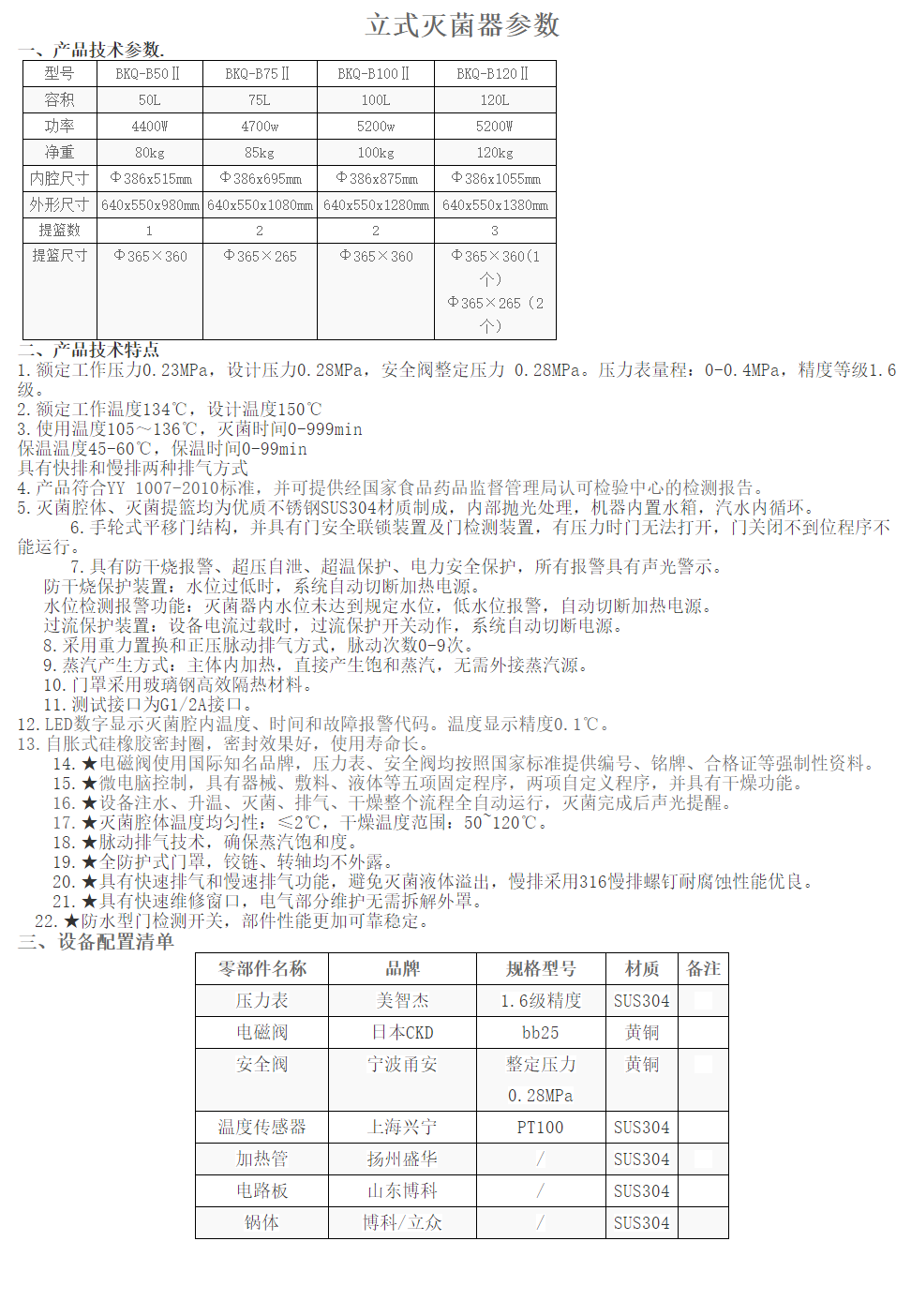 安全防護 1、超溫自動保護裝置:超過設定溫度,系統自動切斷加熱電源; 2、防干燒保護裝置:水位過低時,系統自動切斷加熱電源; 3、超壓自動泄放裝置:超過安全閥開啟壓力,安全閥開啟泄壓; 4、過流保護裝置:設備電流過載時,過流保護開關動作,系統自動切斷電源; 5、漏電保護裝置:當設備出現漏電故障時,系統自動切斷電源。 6、安全連鎖裝置:新型的壓力溫度雙重安全聯鎖,設備起壓后,門無法代開。 7、門檢測裝置:只有滅菌器門關閉到位,電源才能接通加熱產生蒸汽。