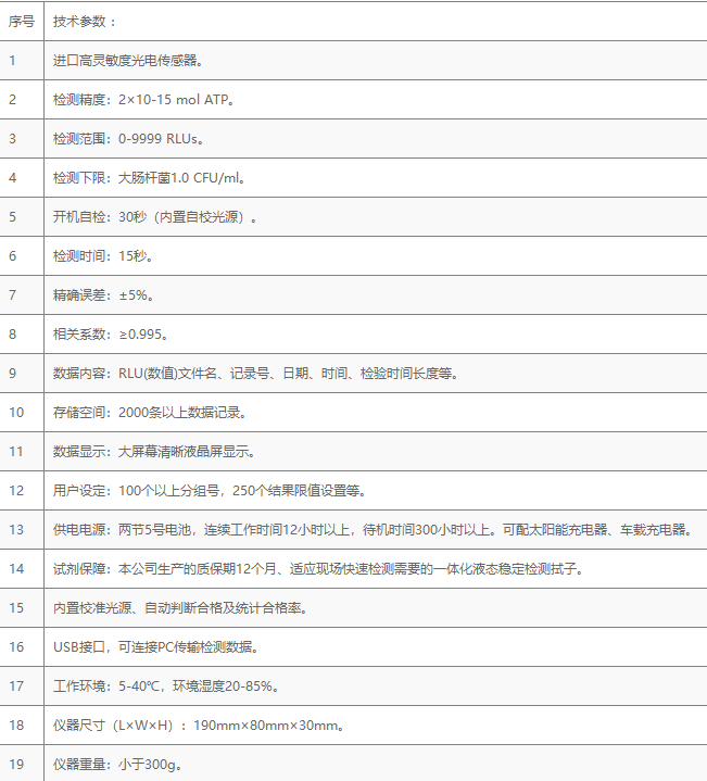 隨機配置:ATP熒光檢測儀(手持)主機、儀器包、掛繩、電池、PC數(shù)據(jù)線、數(shù)據(jù)分析軟件、中文操作手冊。