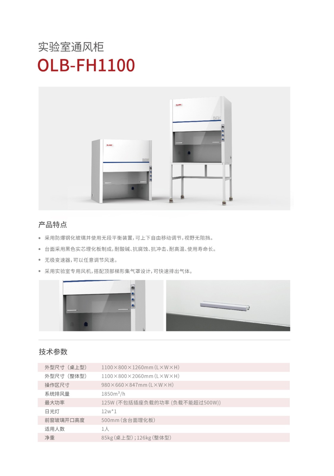 長(zhǎng)度1.1米,操作區(qū)尺寸980*660*847mm,底座1套,采用防爆鋼化玻璃,實(shí)驗(yàn)室風(fēng)機(jī),頂部梯形集氣罩設(shè)計(jì),無(wú)級(jí)變速器,臺(tái)面采用黑色實(shí)芯理化板…