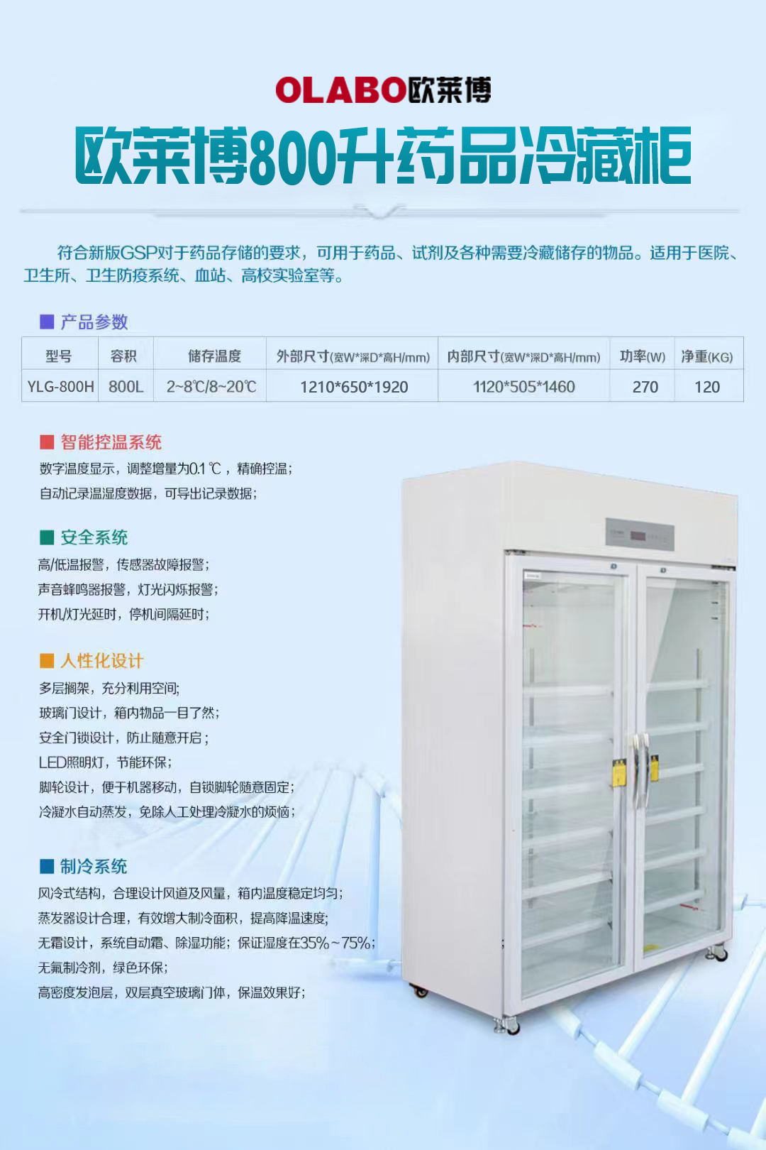 *控制性能:專利防凝露醫(yī)用冷藏箱箱體,專利內(nèi)循環(huán)通風(fēng),完全符合GSP標(biāo)準(zhǔn)